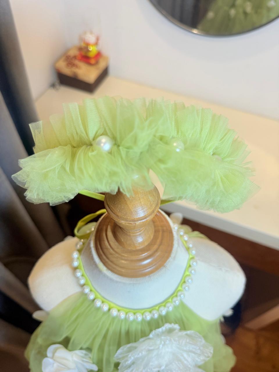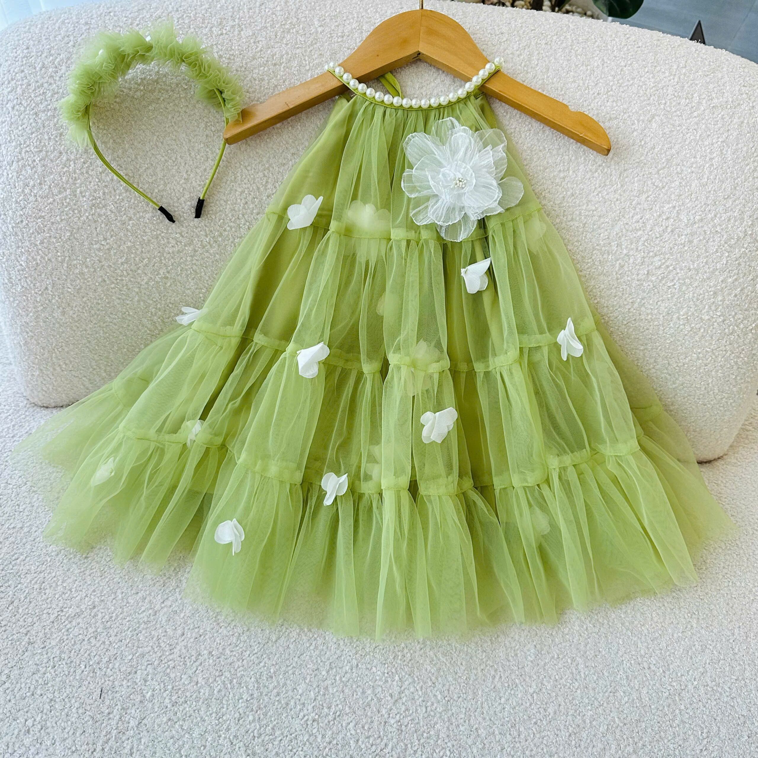 Dress your little angel in elegance with this LIME GREEN frock for girls, designed with delicate 3D floral appliqué and a soft tiered net flare. The halter-neck style with pearl detailing adds a touch of sophistication, making it the perfect outfit for birthday parties, weddings, festive occasions, and photoshoots.