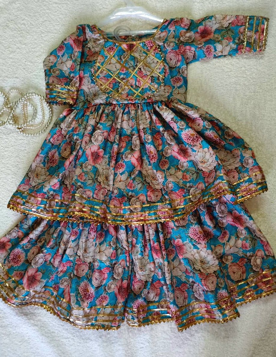 Dress up your little one in this charming floral sharara set that blends tradition with a modern touch. The outfit features a multi-color floral printed kurti in shades of teal blue, pink, and beige, beautifully highlighted with golden gota lace and criss-cross detailing on the yoke and sleeves. The flared kurti is paired with a matching sharara bottom, both finished with shimmering lace borders for a festive look.