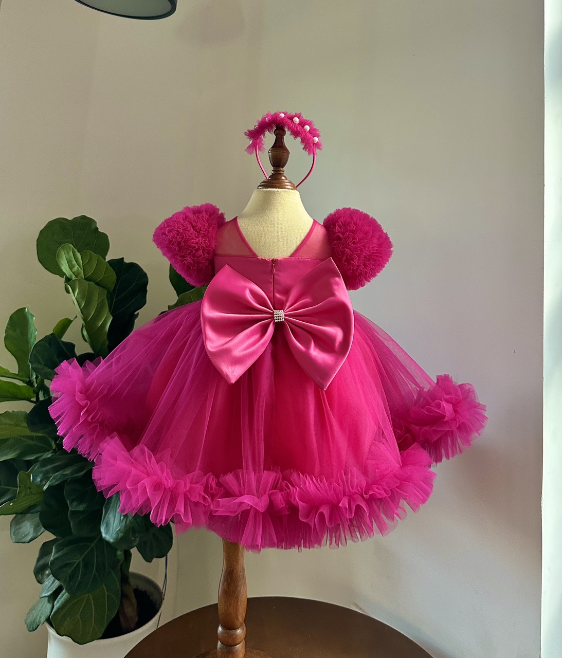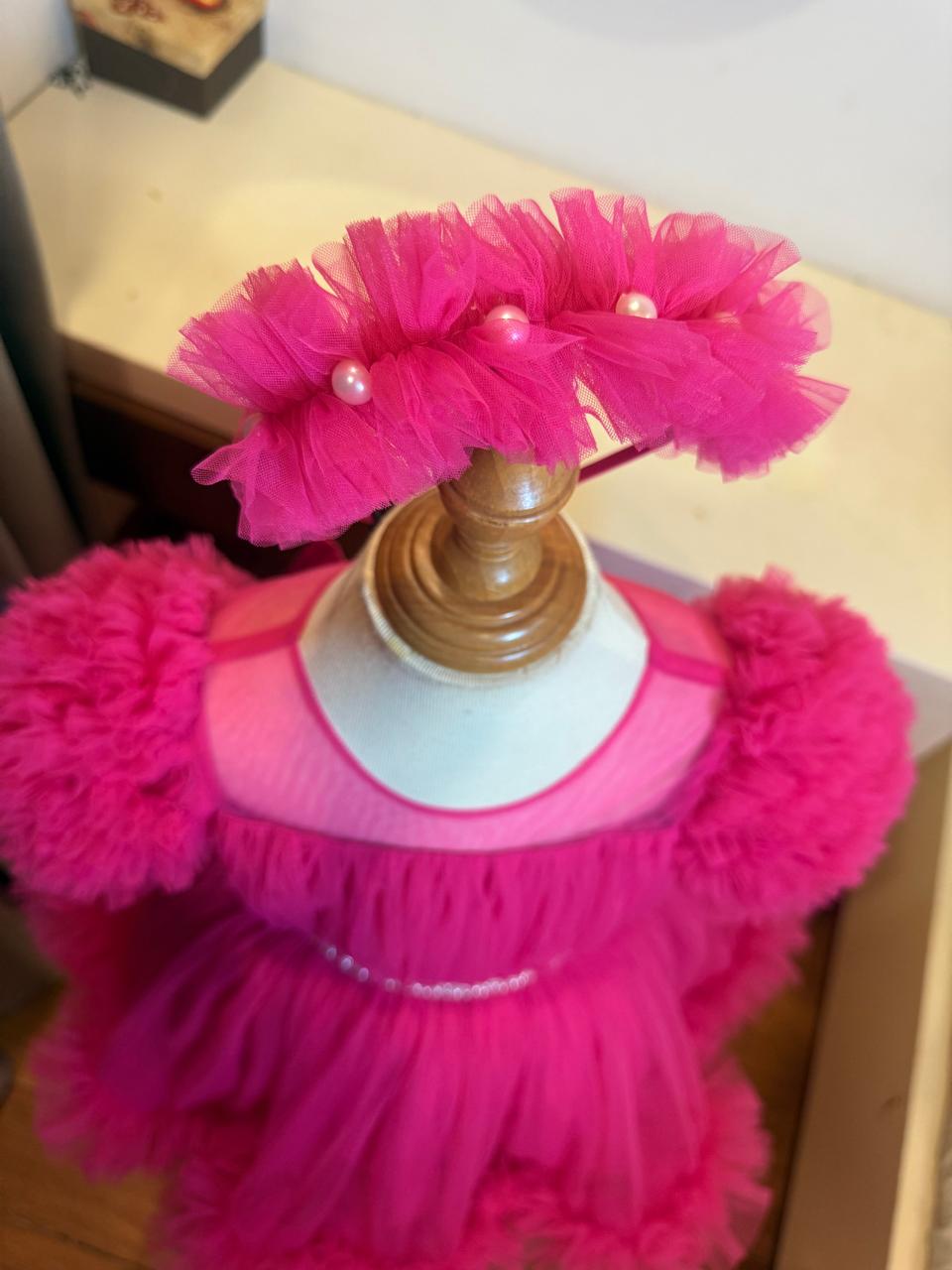 Accessories: The dress is styled with a coordinating headband featuring small, fuzzy magenta accents and small faux pearls or beads, completing the highly coordinated, festive ensemble.