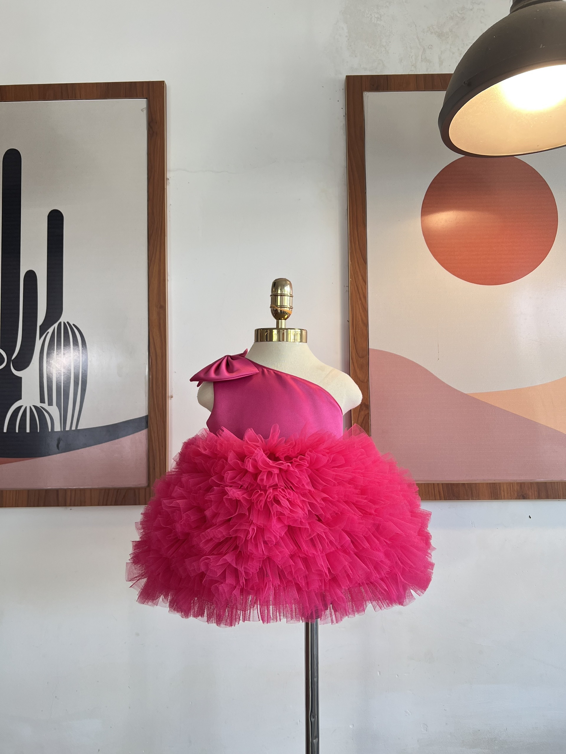 This is an elaborate, high-volume children’s party dress, likely a “frock” or “tutu dress,” designed for a young girl, Its style is characterized by maximalist volume, rich texture, and a striking color, placing it firmly within the category of celebratory or special-occasion wear. It is clearly intended to make a bold visual statement, suggesting a context like a birthday party, family celebration, or formal photoshoot.