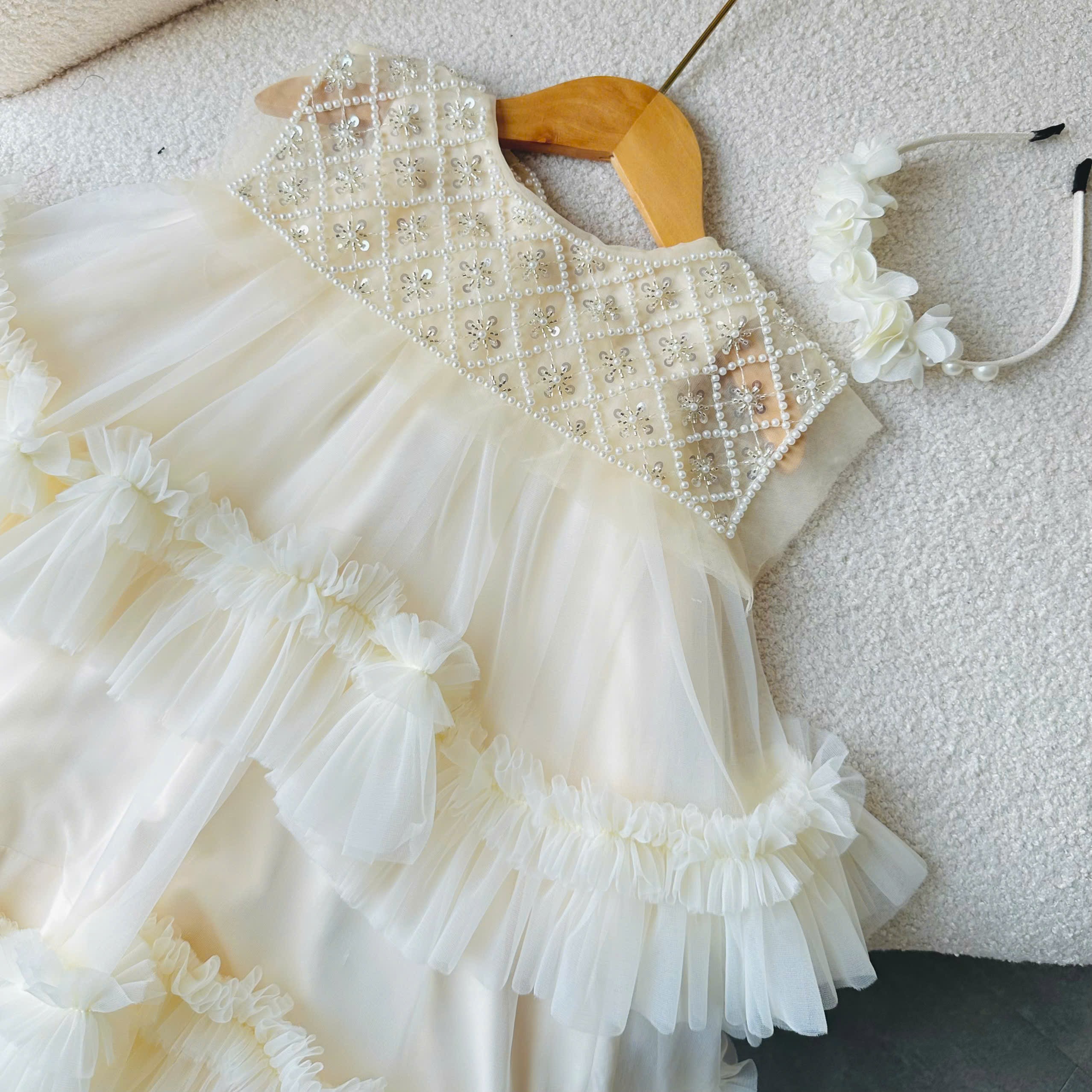 Elegant Ivory Ruffled Tulle & Beaded Kids Frock – Luxury Flower Girl & Special Occasion DressANY